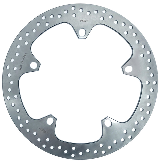 Disco Freno Fisso Accossato. Il disco è intercambiabile a quelli OEM. Diametro esterno: 320 mm - Diametro interno: 181 mm - Spessore: 5 mm . I dischi Accossato racing sono nati dall'esperienza maturata nelle competizioni sportive di superbike, moto 2 e moto 3. Il particolare disegno dei dischi ed i materiali utilizzati permettono di trasferire la forza frenante in maniera efficace, grazie ad un approfondito studio realizzato sulle tolleranze e al gioco tra la campana e la fascia frenante. Il ridotto peso del disco comporta un grande vantaggio nella guidabilità  e nel controllo della moto. Sui dischi Accossato è indicato lo spessore minimo di esercizio del disco, in quanto un disco freno consumato, in caso di sollecitazioni estreme rischia di spezzarsi: si consiglia di sostituire i dischi freno ogni 30/40 mila kilometri o quando il disco risulta essere consumato, presenta graffi, solchi o la fascia frenante scende al di sotto dello spessore di sicurezza.