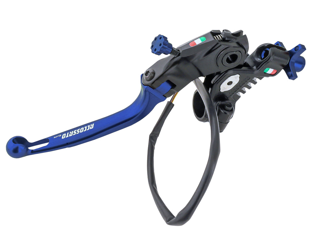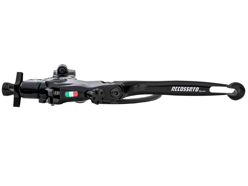 Il comando frizione a cavo è un brevetto esclusivo Accossato. Unico nella sua categoria, oltre alla regolazione a 'click' del cavo, il comando frizione è il solo a vantare anche la regolazione della distanza dell'impugnatura dalla manopola. La leva è snodata, realizzata in alluminio, ricavata dal pieno e anodizzata in vari colori. La lunghezza è standard e è dotata di asola di alleggerimento (RST). Il regolatore del cavo è dello stesso colore della leva. Questa nuova versione permette, grazie ad un perno eccentrico di variare l’interasse fra due valori: 24 mm e 29mm. Per scegliere l'interasse più indicato alle proprie esigenze, è bene conoscere l'interasse attualmente utilizzato e valutare se aumentarlo o diminuirlo. Con un interasse più lungo, a parità di movimento della leva, si avrà un recupero del cavo maggiore: la frizione staccherà prima ma, la forza necessaria per azionare la leva sarà maggiore. Con un interasse più corto, a parità di movimento della leva, si avrà un recupero del cavo minore: la frizione staccherà con un movimento maggiore della leva e la forza necessaria per azionare la leva sarà inferiore. Usa il cavo originale, il micro switch è incluso e l'attacco al manubrio è a 1 pollice.