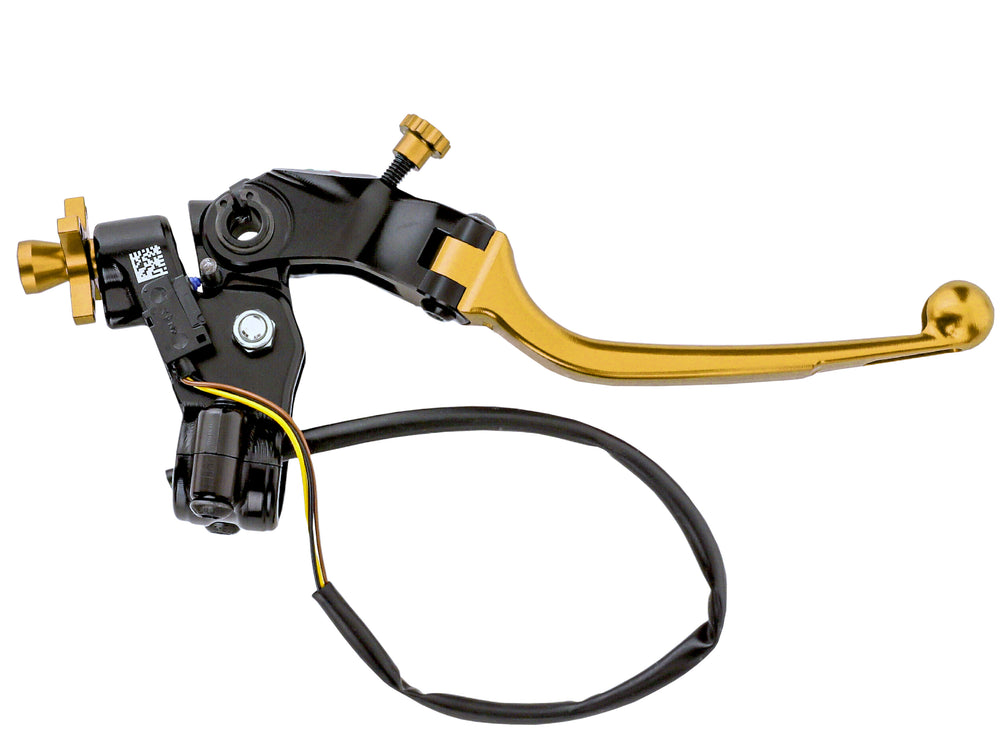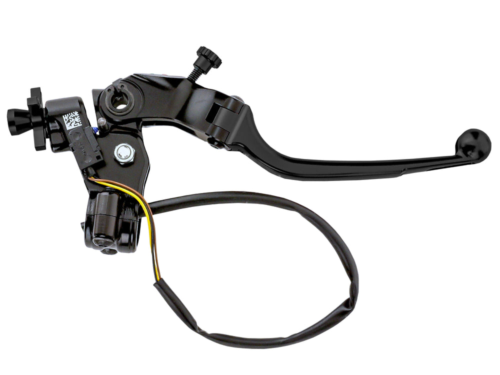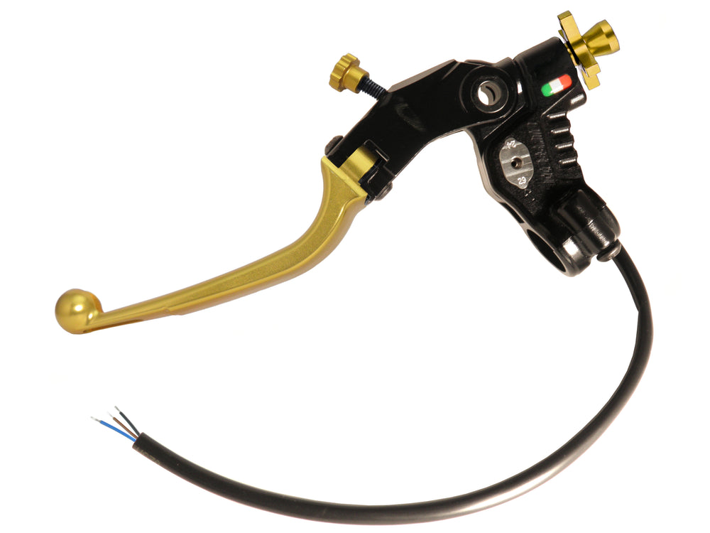 Il comando frizione a cavo Accossato per moto è fornito con leva snodata e microswitch integrato. La leva è realizzata in alluminio, ricavata dal pieno e anodizzata in vari colori. La lunghezza è standard ed è dotata di asola di alleggerimento (RST). Questa nuova versione ha l'interasse regolabile (24mm-29mm). Usa il cavo originale e l'attacco al manubruio è a 1 pollice.