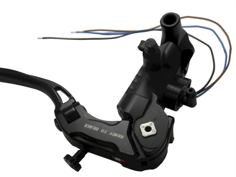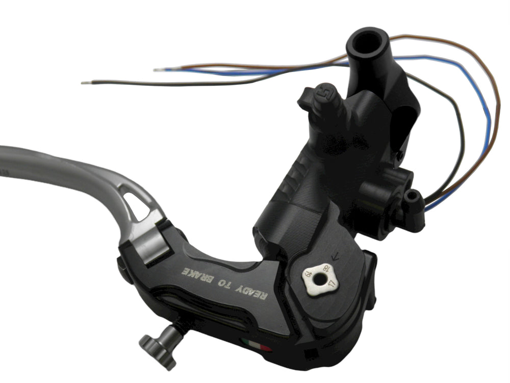 Pompa Freno Ready To Brake Accossato PRS 15x17-18-19 Con Leva Snodata Colorata (Pomello+Leva) - Opzioni leva: RST, Supporto specchio: M10, Vaschetta in Alluminio Integrata: - N/A